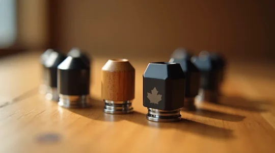 Le drip tip, cet embout buccal souvent négligé, joue un rôle majeur dans votre confort. Le matériau influe sur les sensations : le téflon (Delrin) reste neutre en température et agréable aux lèvres, l’acier inoxydable offre une durabilité maximale mais peut devenir froid en hiver canadien, tandis que la résine permet des designs variés avec un toucher chaleureux.