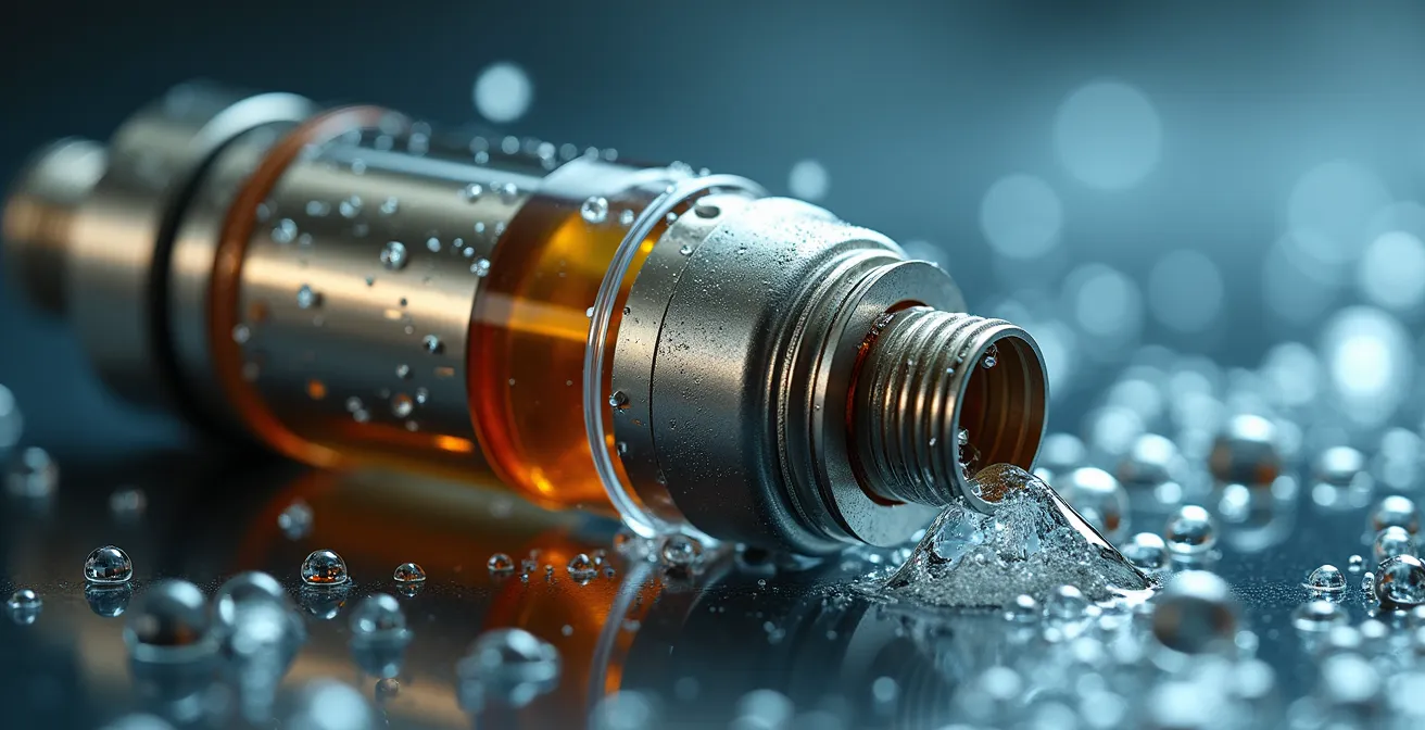 Le phénomène est simple : lorsque cette goutte d’eau entre en contact avec la résistance chauffée à plus de 200°C, elle subit une vaporisation éclair (flash vaporization). L’eau se transforme instantanément en une grande quantité de vapeur, créant une surpression qui fait « pétarader » le liquide et peut même provoquer des fuites par l’airflow. De plus, cette eau résiduelle va inévitablement diluer votre e-liquide. Cela altère non seulement la concentration de nicotine, mais surtout la fidélité des arômes, donnant un goût fade et aqueux. Un séchage obsessionnel est donc une étape non-négociable du protocole de pureté. Utiliser un chiffon microfibre, du papier absorbant roulé en pointe pour les conduits, et surtout, laisser les pièces sécher à l’air libre pendant au moins une heure est impératif.